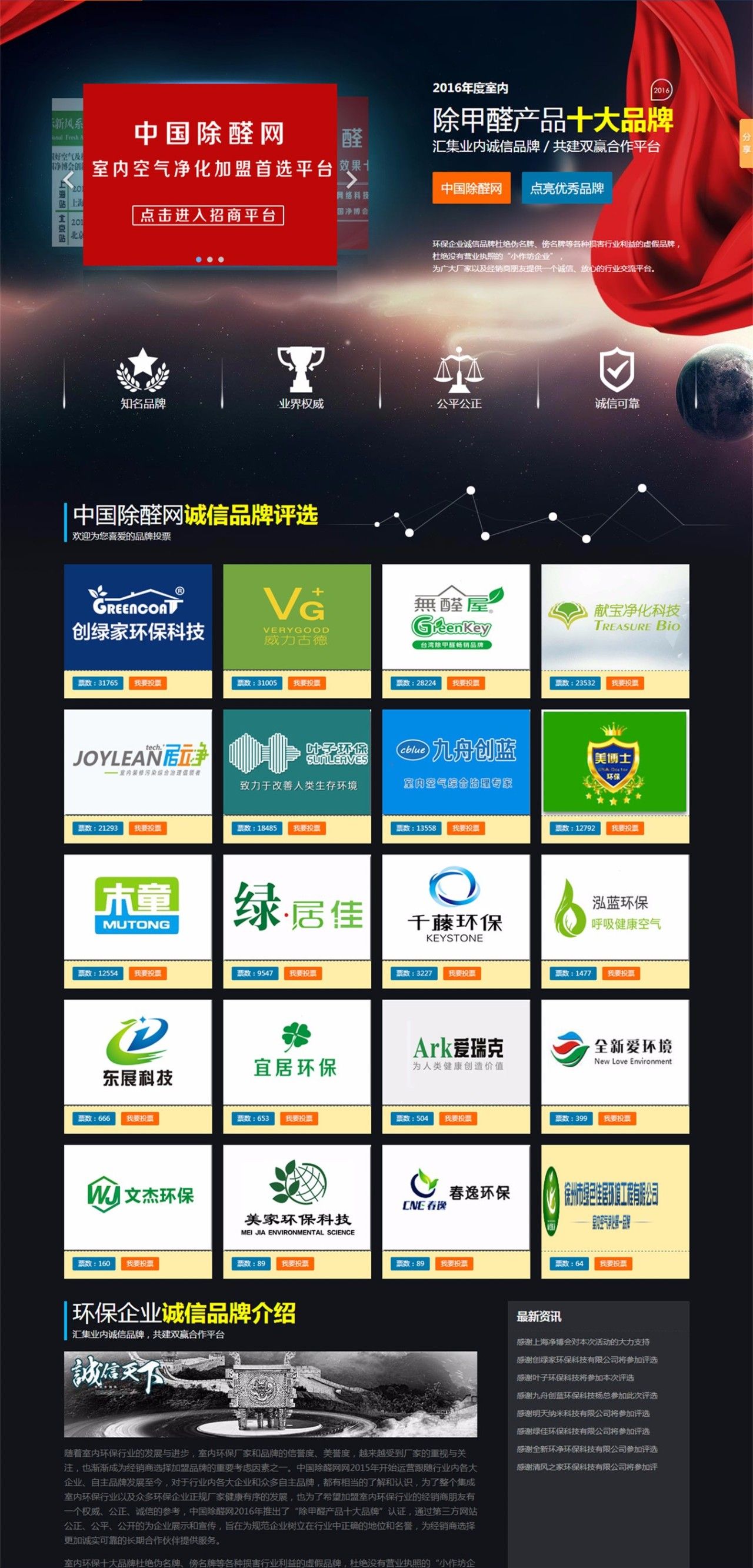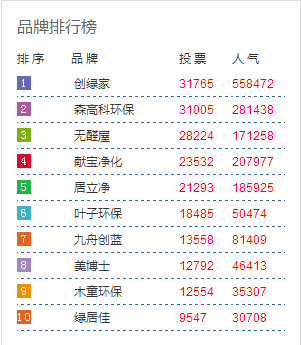 在中國(guó)除醛網(wǎng)舉辦的2016年度室內(nèi)除甲醛產(chǎn)品十大品牌評(píng)選中,經(jīng)過(guò)三個(gè)月的激烈角逐,創(chuàng)綠家一路披荊斬棘進(jìn)入十強(qiáng),并榮獲年度十大品牌之首!