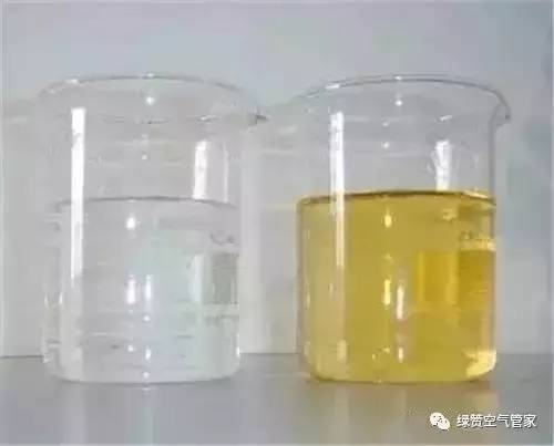 左邊為純凈水、右邊為自來(lái)水,可以明顯看到純凈水沒(méi)有變色,證明沒(méi)有余氯殘留。而自來(lái)水有明顯的變成黃色,證明有一定程度的余氯殘留。