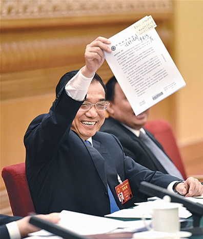 9日,在陜西代表團(tuán)審議現(xiàn)場(chǎng),李克強(qiáng)舉著信說(shuō)“信在這兒,我已經(jīng)批示了”。